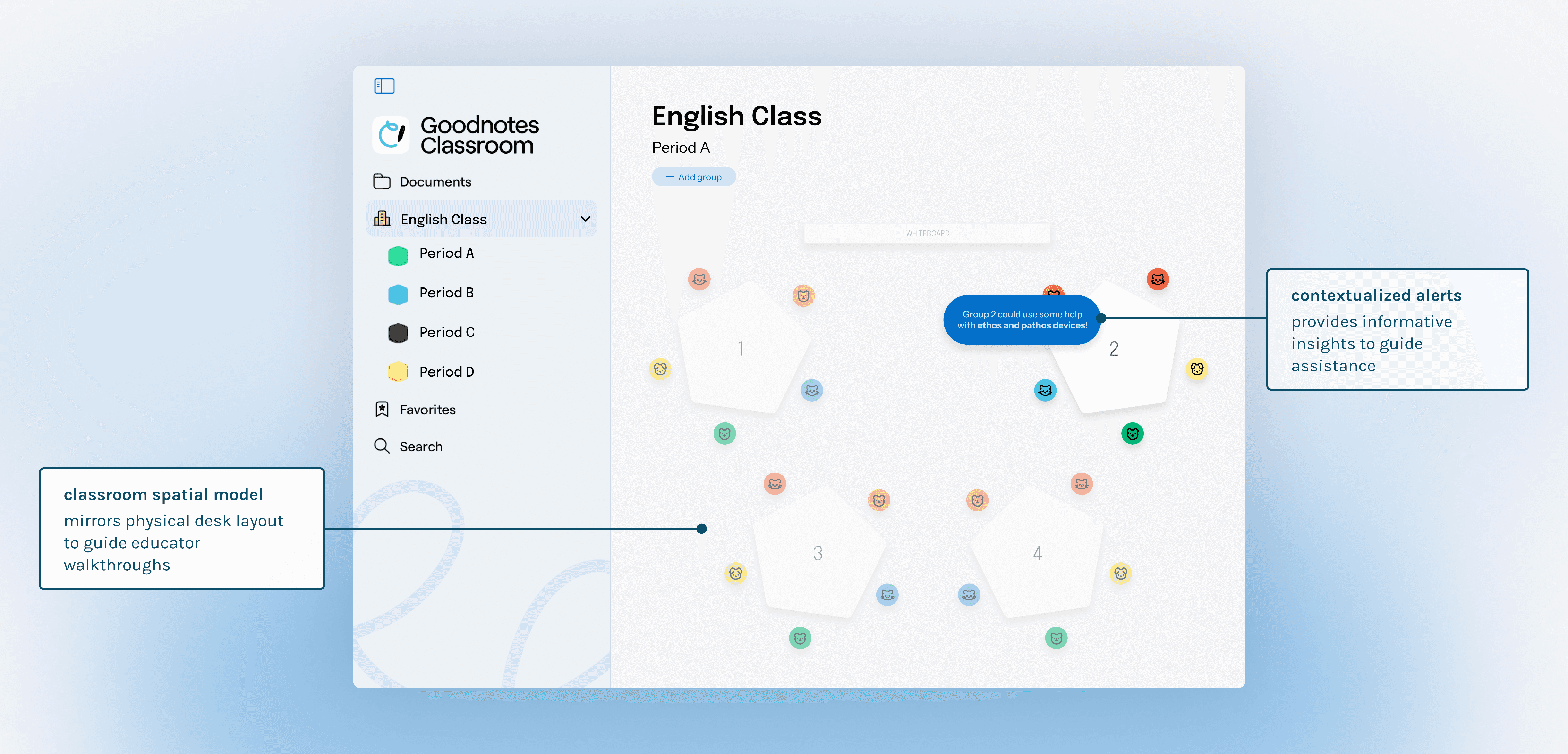 The "Classroom View" mirrors the physical layout of the room so that educators can efficiently navigate the digital progress of their students. Contextualized notifications alert teachers to specific groups in need. Rather than uninformative alerts, the UI provides granular insights, meaning the teacher can walk over with valuable context already in mind.
