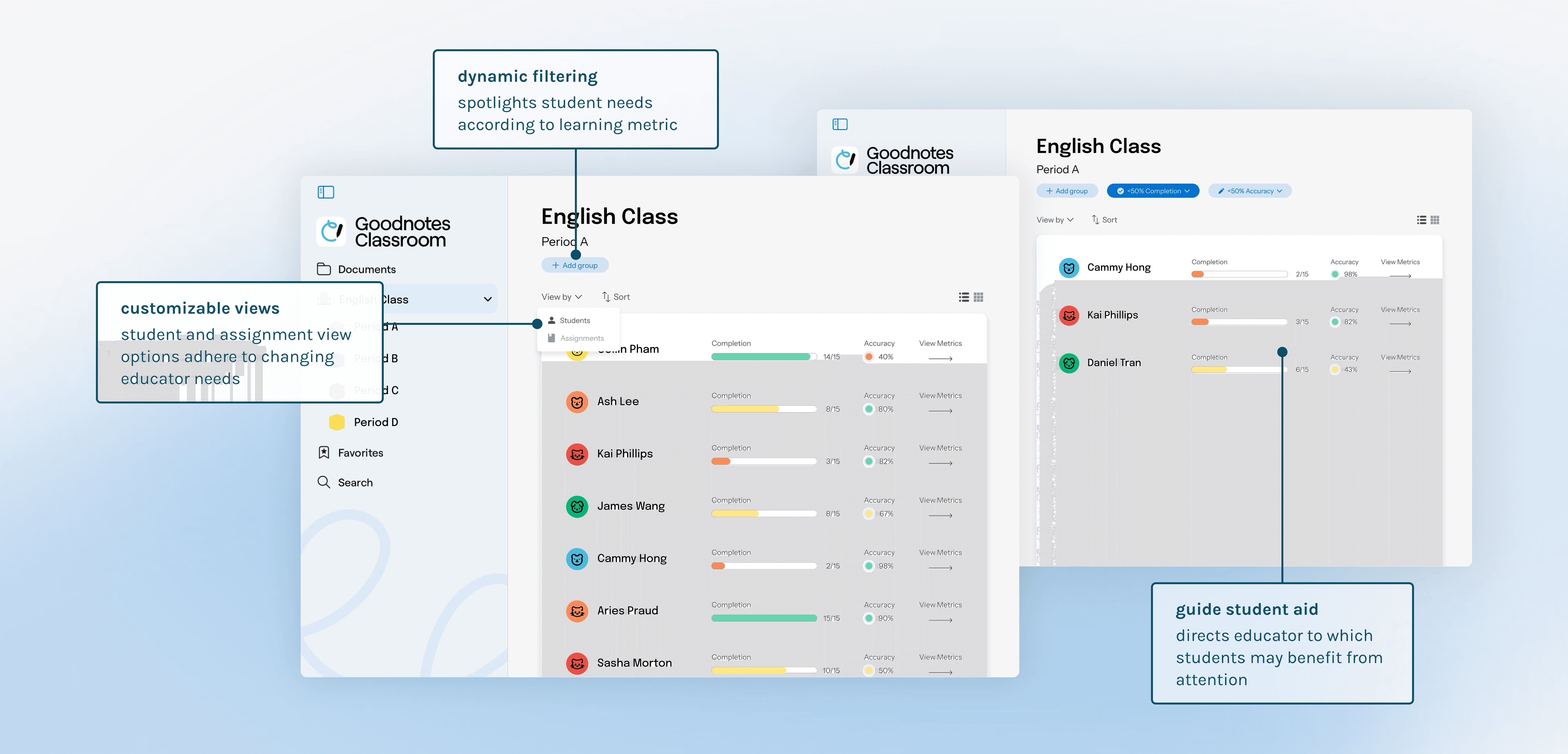 Teachers can filter the class by progress, accuracy, engagement levels, or other custom filters.