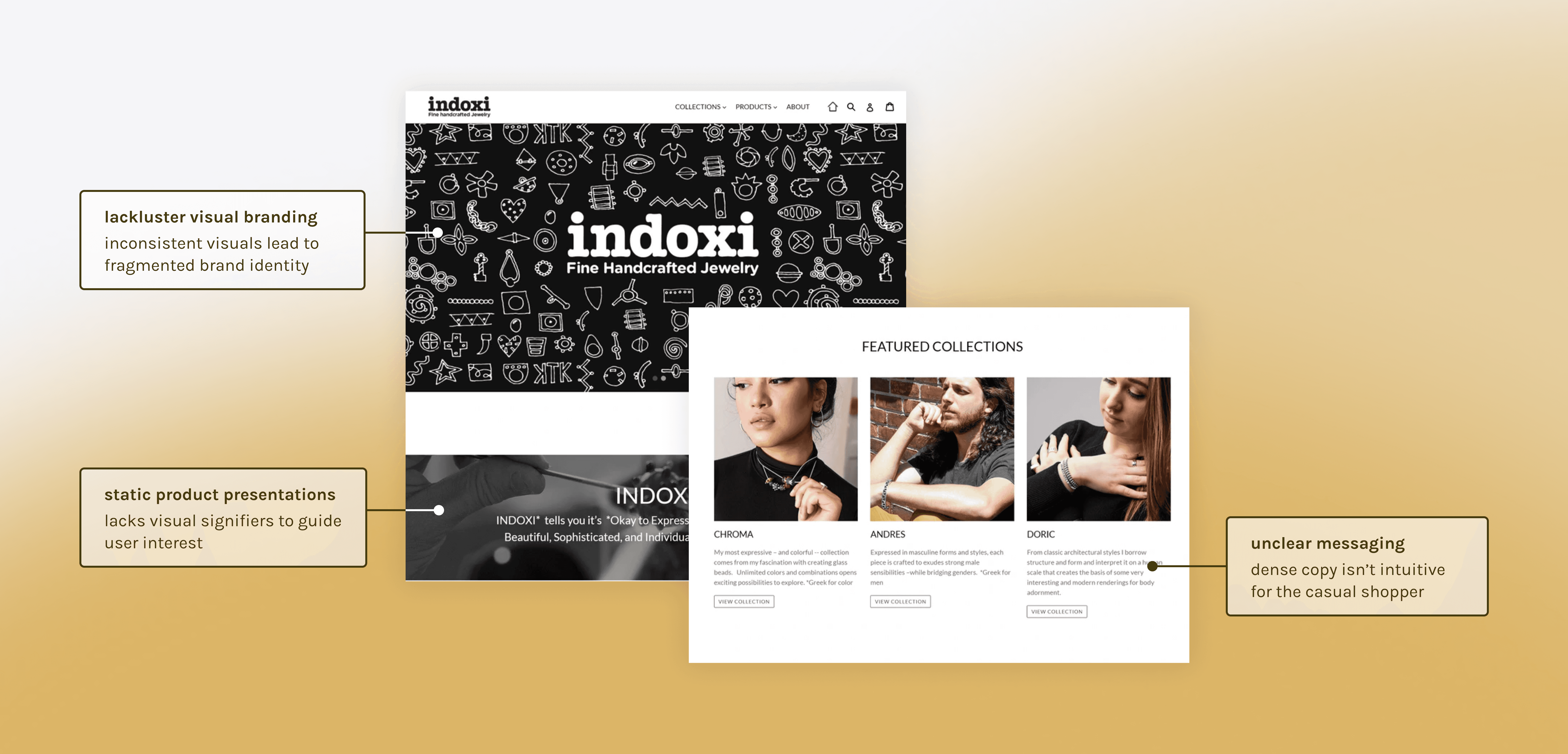 Indoxi is a small jewelry business specializing in handcrafted, bespoke pieces. Their website needs to embody the essence of their brand, reflecting the in-store shopping experience. The site presents several issues, including inconsistent and weak visual branding, as well as a lack of e-commerce and small business management capabilities.